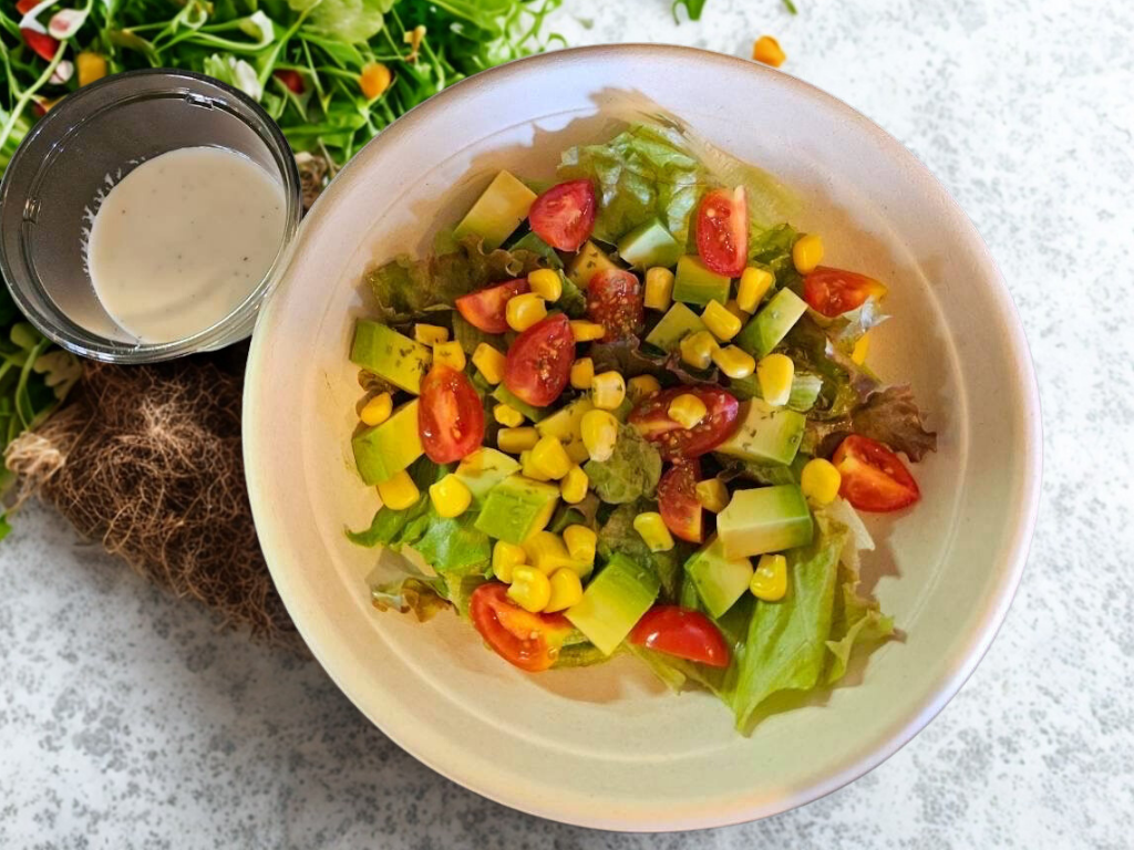 アボカドやトマトなどフレッシュ野菜をシーザードレッシングで。